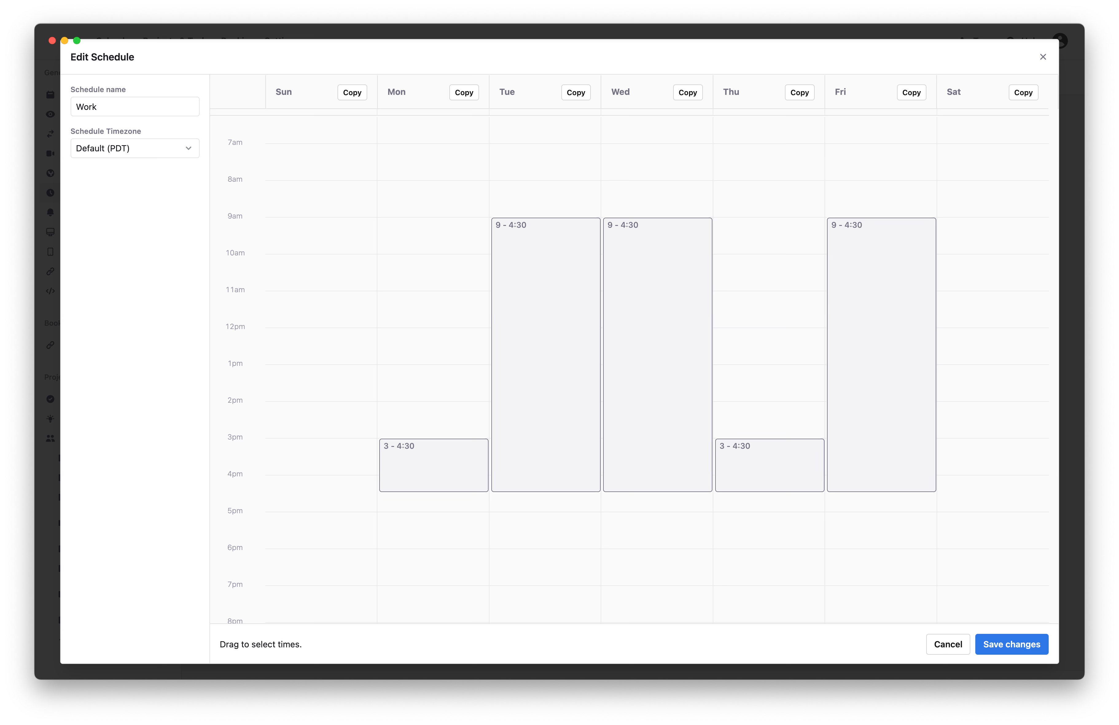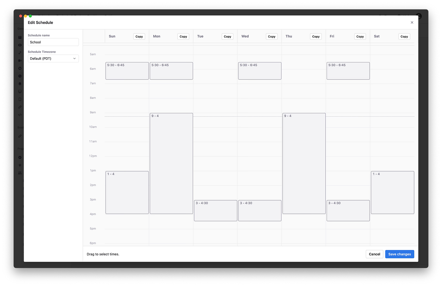 I create Schedules in Motion for Work and School. As you can see, I also allow for some overlap in the afternoons in case there is a high-priority, urgent task for school due on a work day, and vice versa. I also add a few early morning hours to my School schedule for weeks when I get busy.
