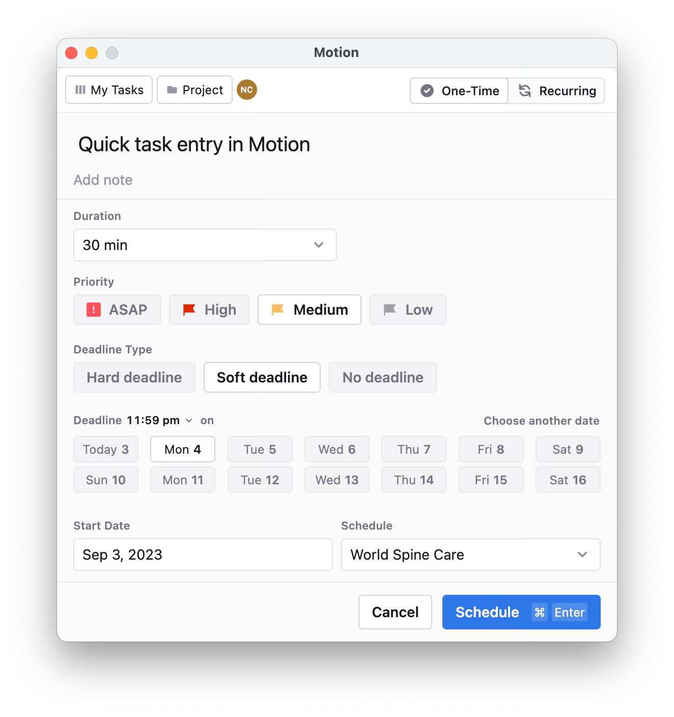 There are a few limitations I've run into. First, Motion isn't pretty. Coming from Things – a macOS native app whose developers think deeply about UI – the Chromium-based Electron app can sometimes feel fragile and … sticky on Mac. Motion does have a quick task entry window with a universal keyboard shortcut, but it doesn't feel as smooth or intuitive as the similar feature on Things.