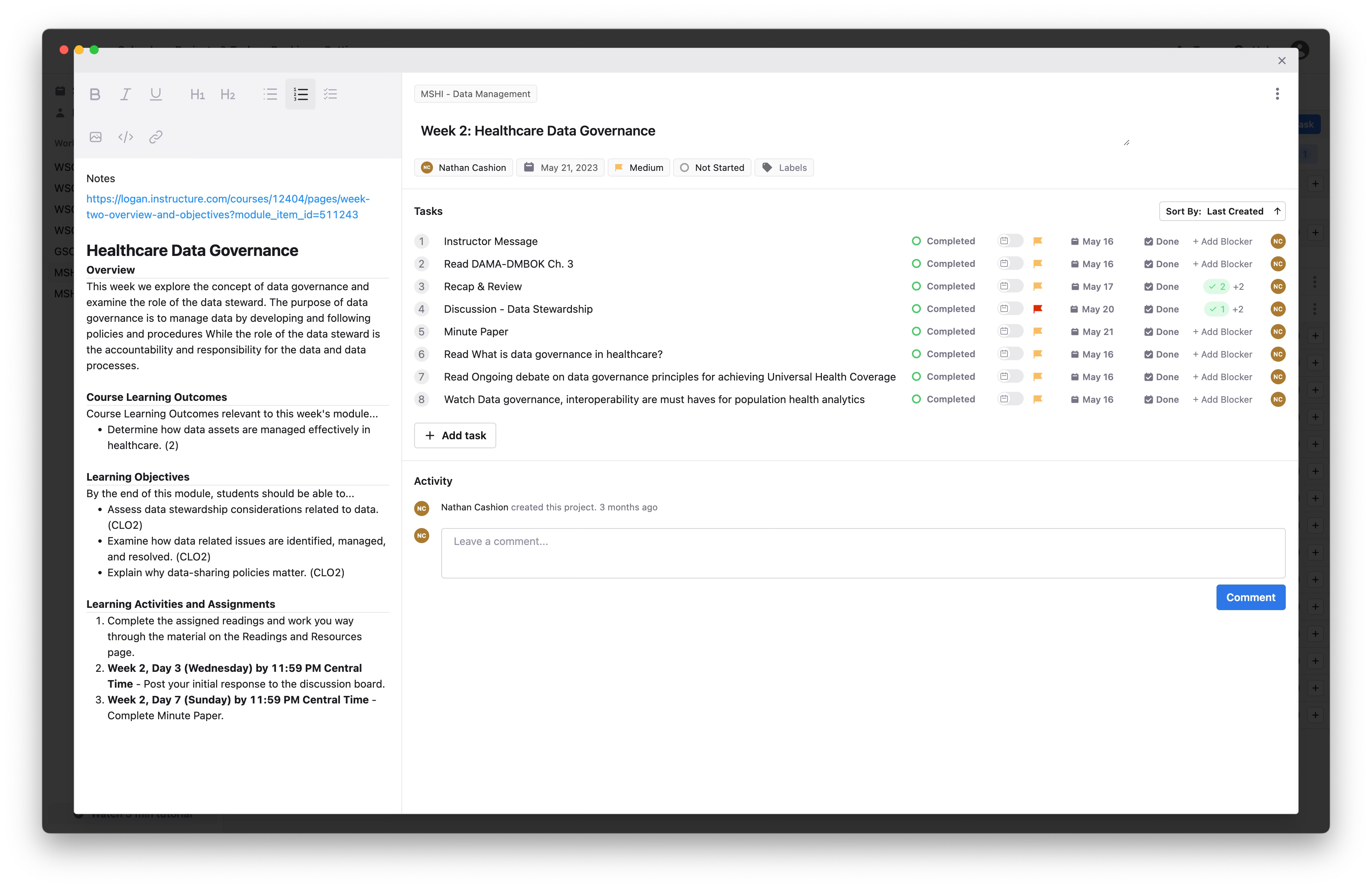 I like to add a link to the Canvas page for the module and other information in the Project Notes. This makes it easy for me to open Canvas in the browser. I also add links to specific assignments in the Task notes. This makes it easy to open the Canvas page when it's time to submit my assignment.