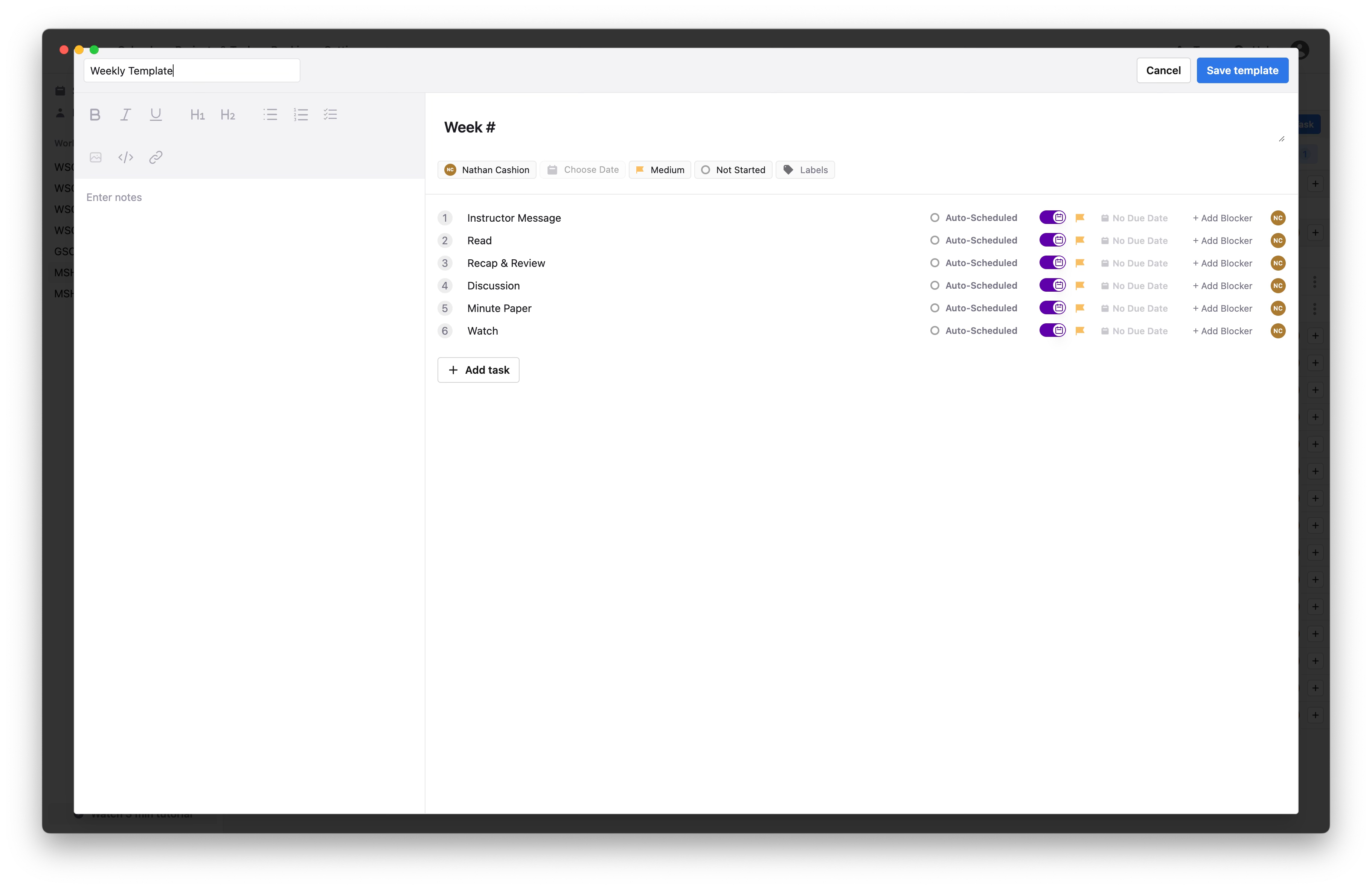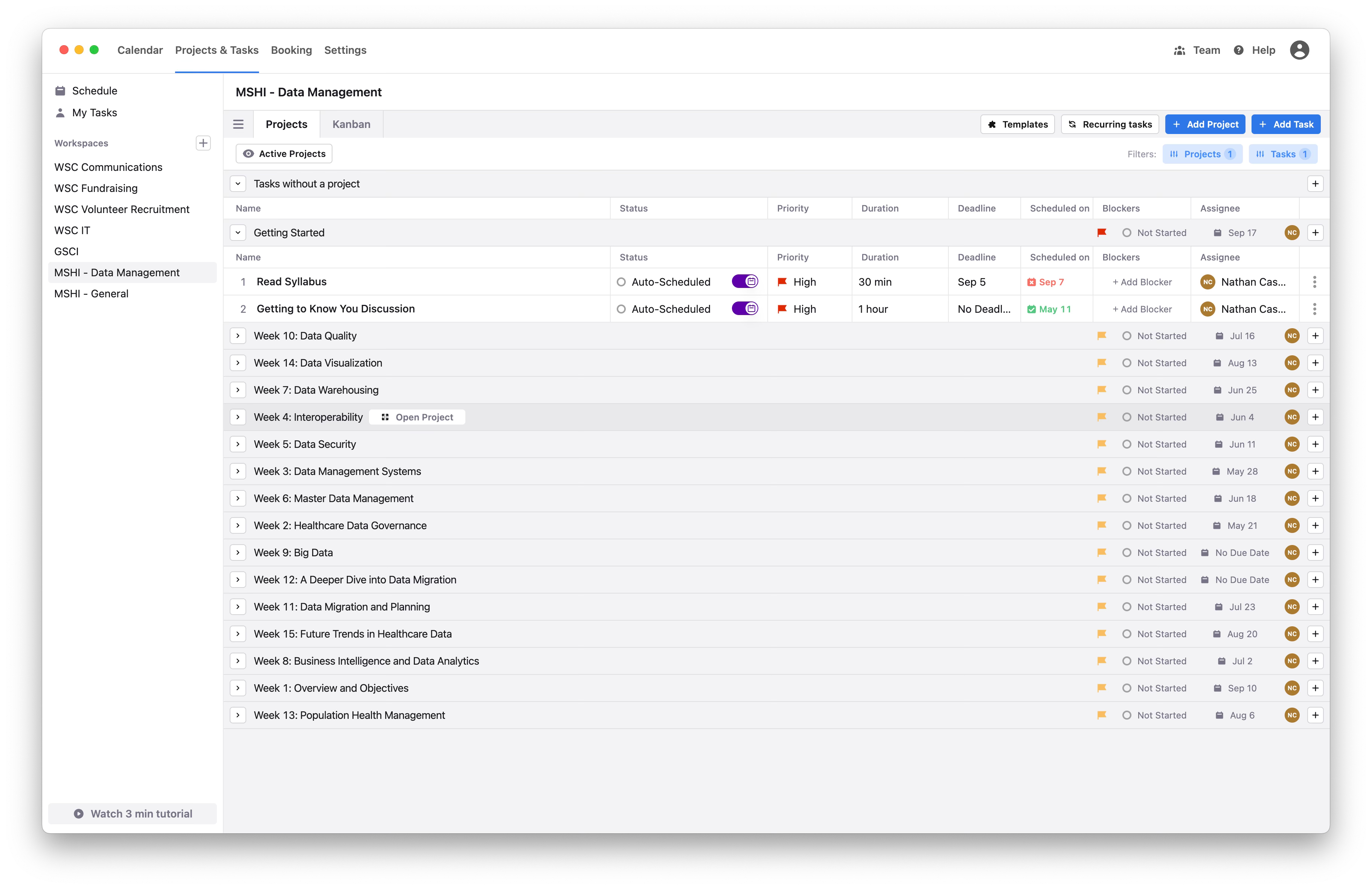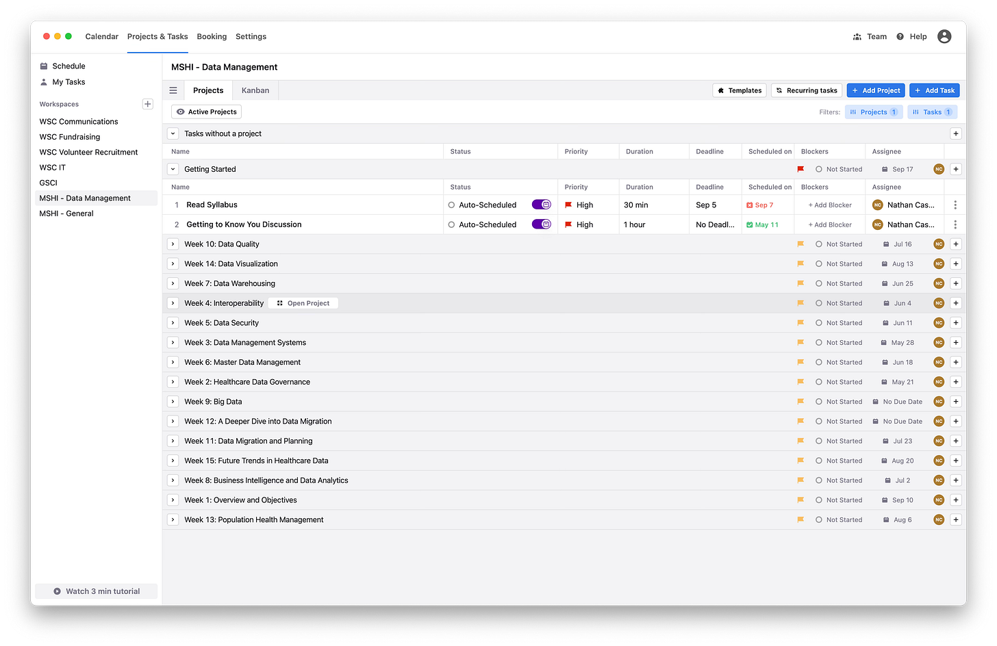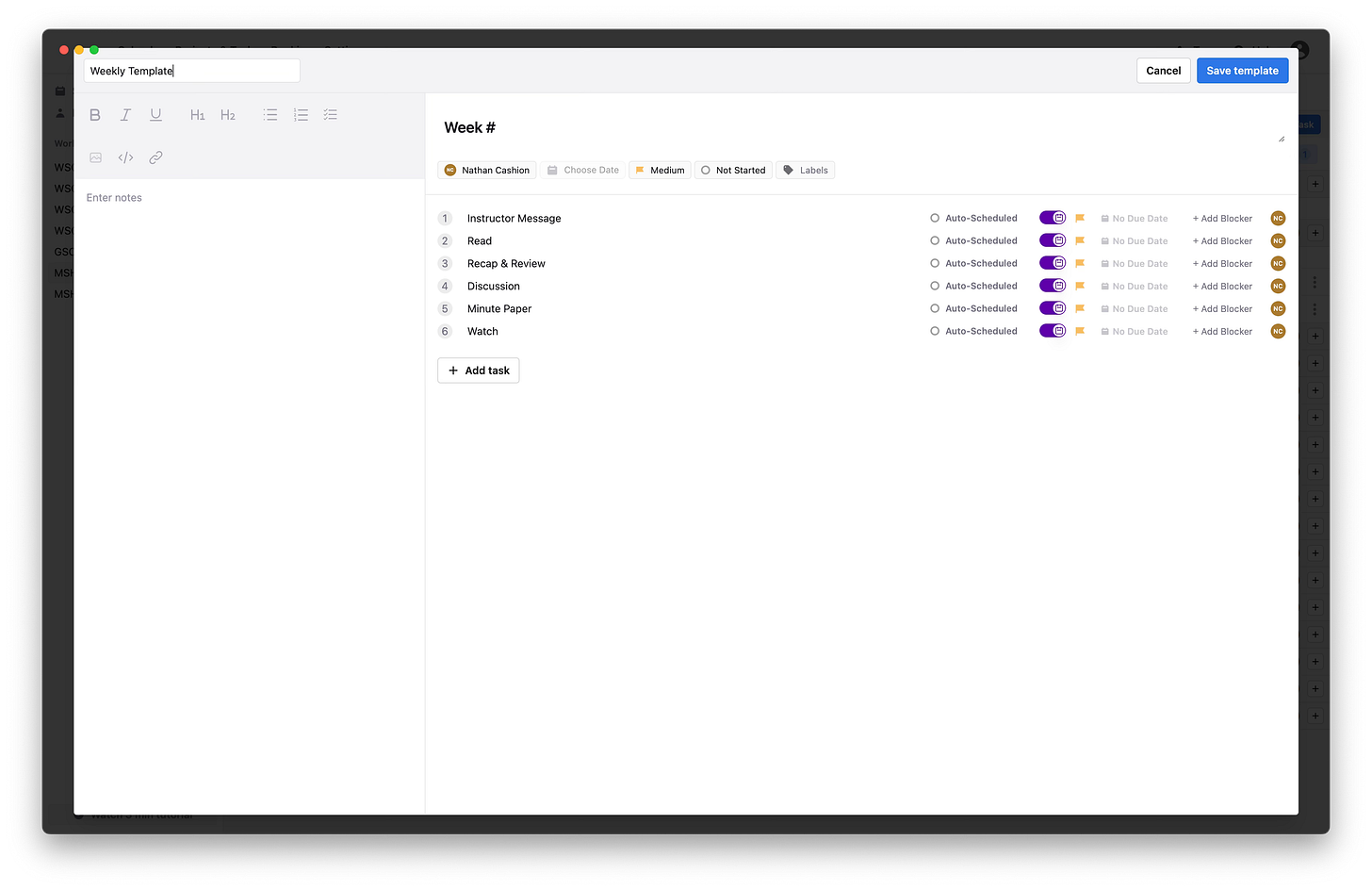 I create a Project template in the Workspace for each course with these tasks in this order. A bonus to using the Template is that I can set a default Schedule for each task. This saves me a bit of time and a lot of clicks – and sanity – when creating 15 projects for each class.